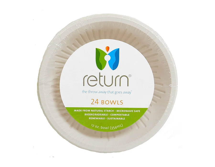 Return® products are made from natural (Non GMO) plant starch, natural polyesters, food safe colors and other biodegradable ingredients. They are compostable, microwavable, water and grease resistant, and crack and cut resistant.