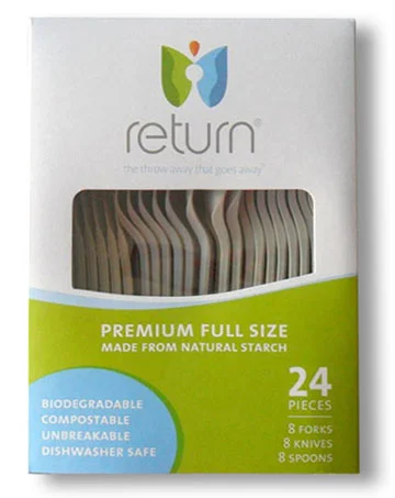 Return® products are made from natural (Non GMO) plant starch, natural polyesters, food safe colors and other biodegradable ingredients. They are compostable, microwavable, water and grease resistant, and crack and cut resistant.